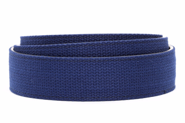 This Navy Canvas front, leather backed strap is 1.5" wide and uses Micradjust Technology® for the perfect fit. As our widest offered Anson Belt it's perfect for wearing with jeans.